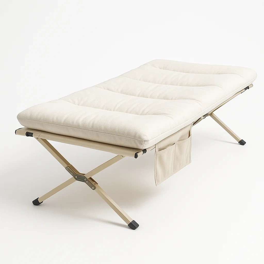 Lit de camping pliable en métal avec matelas en polyester beige