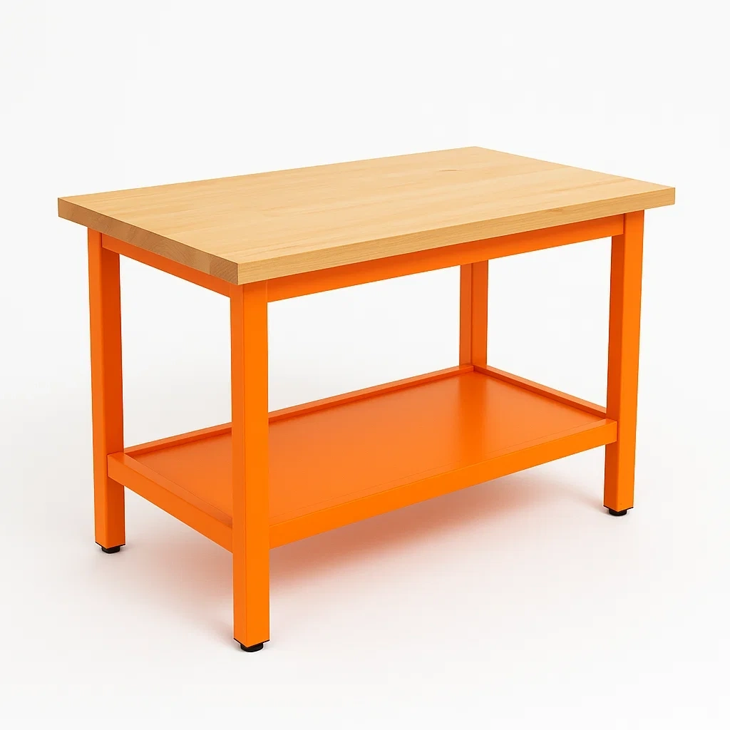 Matériaux : Plateau en bois massif, structure en acier peint de couleur orange.